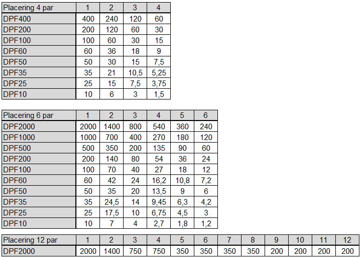 - Dette betyder, at man i DPF60 ikke må erstatte et seedet 1-par med 850 point med et par med 1050 point, da den generelle pointrestriktion i DPF60, når DPF60 er den højest udbudte række, er 1000 point.