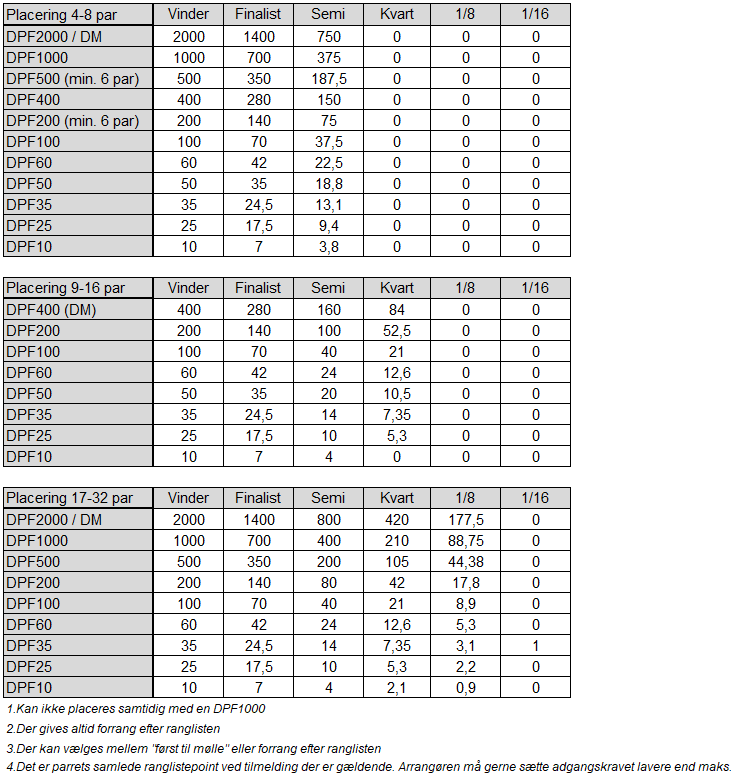 I hovedturneringen tildeles point efter den opnåede placering. Taber man eksempelvis semifinalen i en DPF500-turnering med otte par, får man 187,5 point.